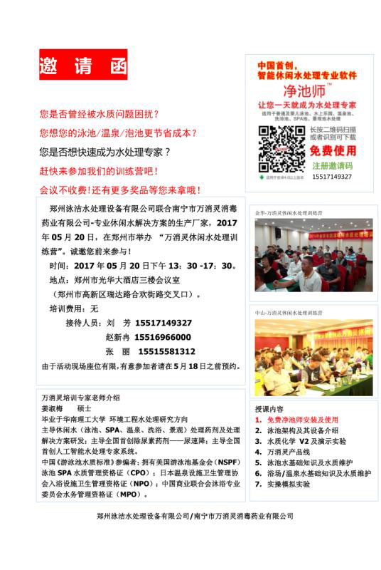 了解更多+鄭州泳潔水處理設(shè)備有限公司聯(lián)合南寧萬(wàn)消靈消毒藥業(yè)有限公司-專(zhuān)業(yè)休閑水解決方案的生產(chǎn)廠(chǎng)家,2017年05月20日(這周六),在鄭州市舉辦“萬(wàn)消靈休閑水處理訓(xùn)練營(yíng)”,誠(chéng)邀您前來(lái)參與!
