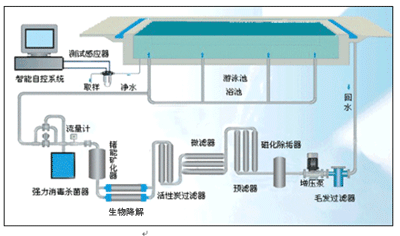 城市泳池水處理系統(tǒng)由于當(dāng)初設(shè)計(jì)的局限性和后期的污染及水質(zhì)管理措施等方面的問題,導(dǎo)致水質(zhì)迅速惡化,水處理效果大為降低.游泳池水處理系統(tǒng)方案設(shè)計(jì):