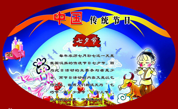 其起源于對(duì)自然的崇拜及婦女穿針乞巧,后被賦予了牛郎織女的傳說使其成為象征愛情的節(jié)日。現(xiàn)被認(rèn)為是“中國(guó)情人節(jié)”。