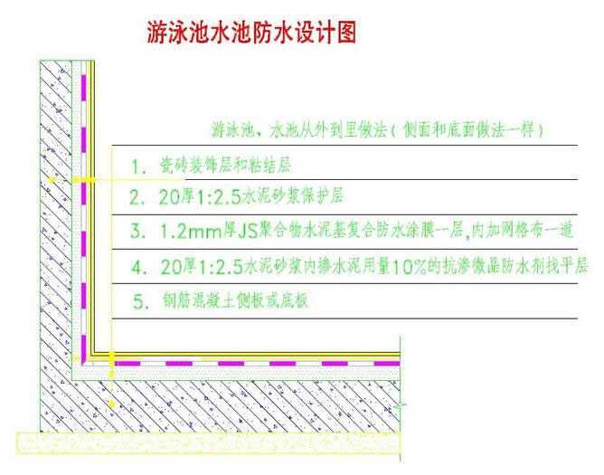 以上就是一個(gè)完整的標(biāo)準(zhǔn)的游泳池防水做好了。由于我們國(guó)家無(wú)建筑防水專業(yè),所以面對(duì)游泳池防水設(shè)計(jì)似乎沒(méi)標(biāo)準(zhǔn)可言,很多人設(shè)計(jì)人員也不知道游泳池里面需要做一道剛性微晶防水層的,只知道做防水涂料,此防水方案是我公司用10多年的建筑結(jié)構(gòu)設(shè)計(jì)經(jīng)驗(yàn)結(jié)合對(duì)多個(gè)游泳池防水設(shè)計(jì)的跟蹤得出的結(jié)果。游泳池防水必須做剛?cè)峤Y(jié)合兩道設(shè)防,那樣才是保險(xiǎn)的,其實(shí)真正起到防水作用的是游泳池的鋼筋混凝土底板和側(cè)板,微晶防水剛性層,防水涂料其實(shí)是起到輔助防水,但很多設(shè)計(jì)師也不是很清楚。