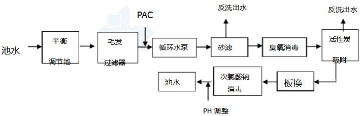 將水中毛發(fā)、大的懸浮物截留住,以免毛發(fā)纏繞泵的葉輪,影響后繼設(shè)備運(yùn)行;出水加入混凝劑后,在管道內(nèi)發(fā)生混合反應(yīng),將水中微小懸浮物凝聚,產(chǎn)生礬花經(jīng)高速過濾器后經(jīng)石英砂過濾器截留;后經(jīng)過臭氧消毒,后的水通過活性炭吸附去除水中剩余的臭氧,經(jīng)過換熱器,使水溫達(dá)到相應(yīng)要求;此時(shí)加入消毒劑,以殺滅水中細(xì)菌,保持一定的余氯量,然后池水重新回到泳池。