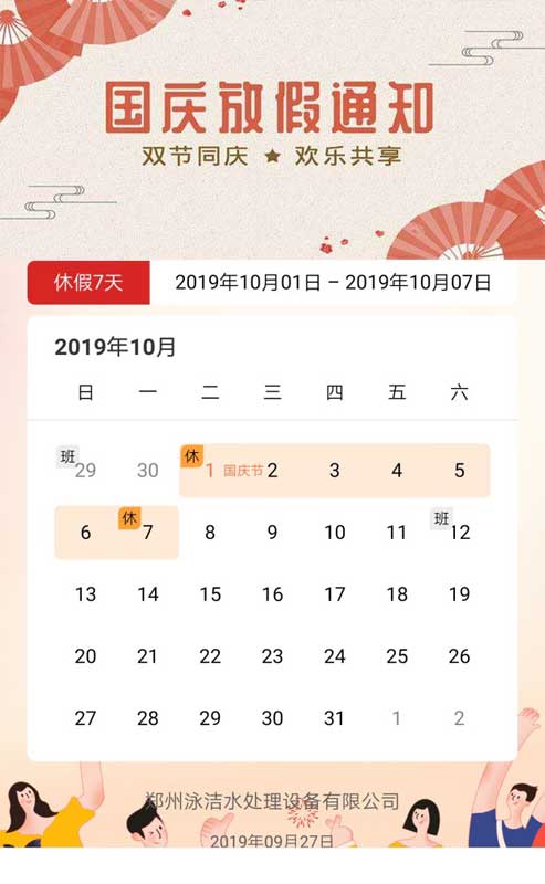 國慶佳節(jié)即將到來,根據(jù)國務院關于法定節(jié)假日的規(guī)定和我單位工作實際情況,現(xiàn)將2019年國慶節(jié)放假的有關事項通知如下: