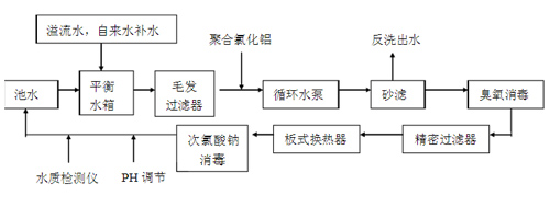 本方案采用當(dāng)今世界先進(jìn)的水?dāng)M定工藝為典型的游泳池循環(huán)水處理工藝,其目的主要是去除水中懸浮雜質(zhì),消毒滅菌,滿足衛(wèi)生要求。正常循環(huán)時,游泳池水通過回水管流入平衡水箱,在平衡水箱后循環(huán)泵吸水管上加入絮凝劑,以便通過水泵時能充分與水混合;池水經(jīng)過毛發(fā)過濾器截留較大顆粒固體雜質(zhì)、毛發(fā)、纖維等,以保護(hù)水泵和砂缸過濾層不被破壞;出水經(jīng)循環(huán)水泵進(jìn)入高速過濾砂缸進(jìn)行微絮凝過濾;然后經(jīng)過臭氧消毒,再通過精密過濾器進(jìn)一步過濾去除水中5微米以上的雜質(zhì),經(jīng)過換熱器,使水溫達(dá)到相應(yīng)要求。此時加入消毒劑,以殺滅水中細(xì)菌,保持一定的余氯量,再經(jīng)過PH檢測調(diào)整后循環(huán)至游泳池。