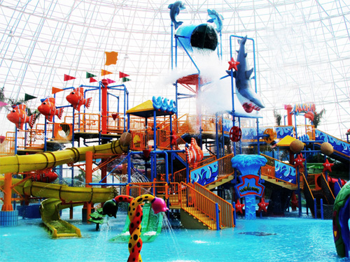 此水上樂園設(shè)備以神奇的海洋生物為主題風(fēng)格,一個(gè)大翻桶正居中央,多條滑梯如各通道盤繞在周邊。占地面積約1700平方米。