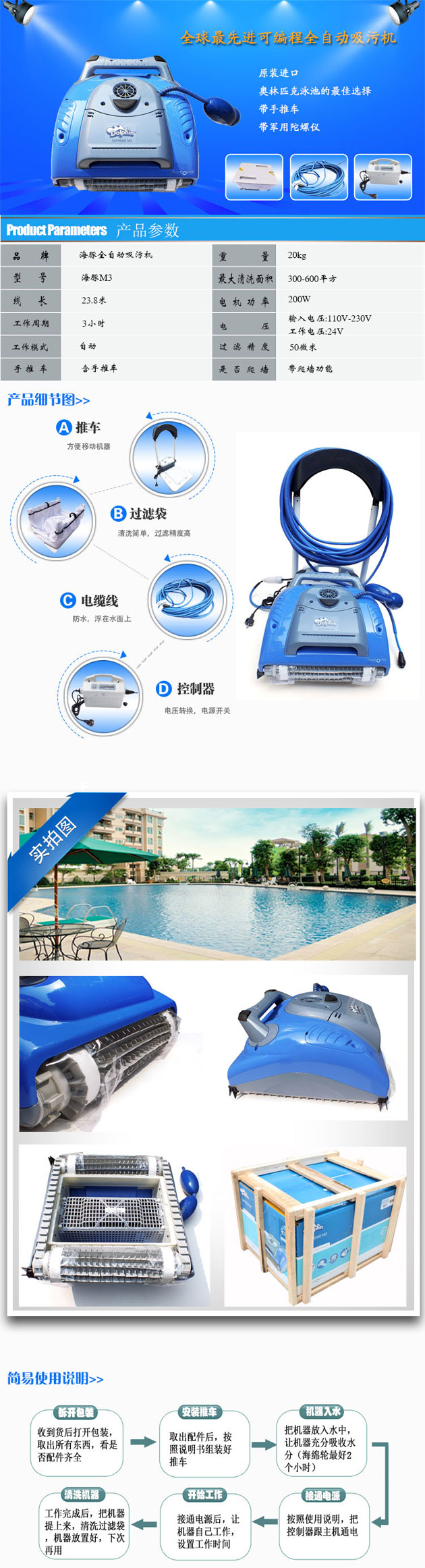 海豚M3全自動(dòng)泳池吸污機(jī)能夠給你提供一個(gè)數(shù)小時(shí)干凈、清澈、衛(wèi)生的泳池享受。