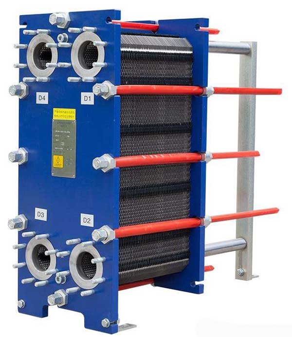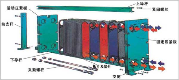 板式換熱器是由一組波紋形的平行金屬板構(gòu)成的,在板片的4個拐角出都有通道孔,板被夾緊在一個富有連接管的固定板和活動壓緊板的框架中,并用夾緊螺栓加以夾緊。這些鏈接管同板上的通道孔對中,并與熱交換的兩種液體的外部管理相連,傳熱板和活動壓緊板懸掛在頂部承載梁的下面并由底部橫梁使其對準(zhǔn)定位。傳熱板本身是有器有特定形狀并被固緊的電熱片密封,以防止外部泄露,并把熱交換的兩種液體按逆流方式交替地流過另一對傳熱板之間的通道內(nèi)。板片上的波紋不但提高流體的串流程度,并且形成許多接觸點(diǎn),以承受正常的運(yùn)行壓力。